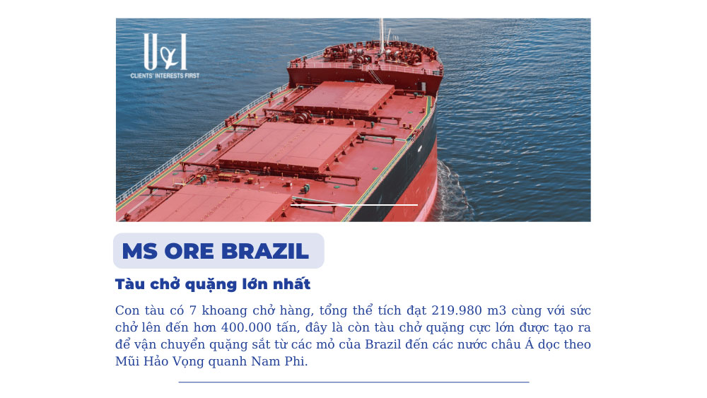 MS Ore Brazil thuộc sở hữu của công ty khai thác mỏ Vale (Brazil). Con tàu có 7 khoang chở hàng, tổng thể tích đạt 219.980 m3 cùng với sức chở lên đến hơn 400.000 tấn, đây là còn tàu chở quặng cực lớn được tạo ra để vận chuyển quặng sắt từ các mỏ của Brazil đến các nước châu Á dọc theo Mũi Hảo Vọng quanh Nam Phi.