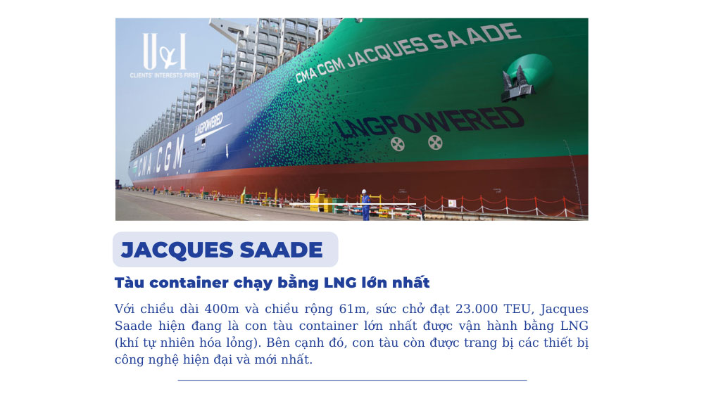 Với chiều dài 400m và chiều rộng 61m, sức chở đạt 23.000 TEU, Jacques Saade hiện đang là con tàu container lớn nhất được vận hành bằng LNG (khí tự nhiên hóa lỏng).