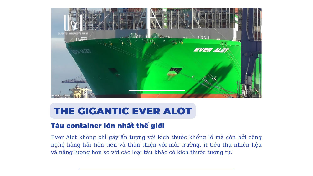 Với sức chứa vượt qua mốc 24.000 TEU, Ever Alot hiện là tàu container lớn nhất trên thế giới. Ever Alot không chỉ gây ấn tượng với kích thước khổng lồ mà còn bởi công nghệ hàng hải tiên tiến và thân thiện với môi trường, ít tiêu thụ nhiên liệu và năng lượng hơn so với các loại tàu khác có kích thước tương tự.