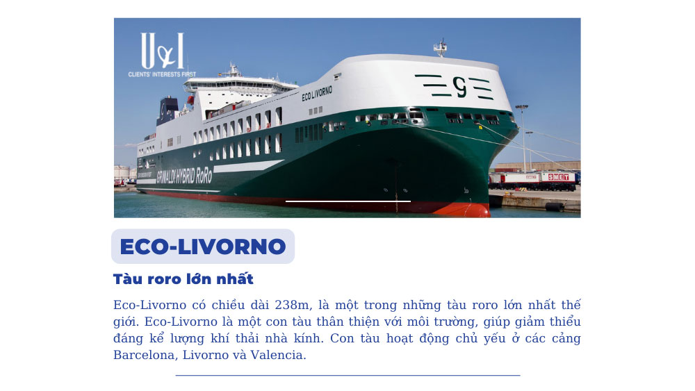 Eco-Livorno có chiều dài 238m, là một trong những tàu roro lớn nhất thế giới. Eco-Livorno là một con tàu thân thiện với môi trường, giúp giảm thiểu đáng kể lượng khí thải nhà kính.