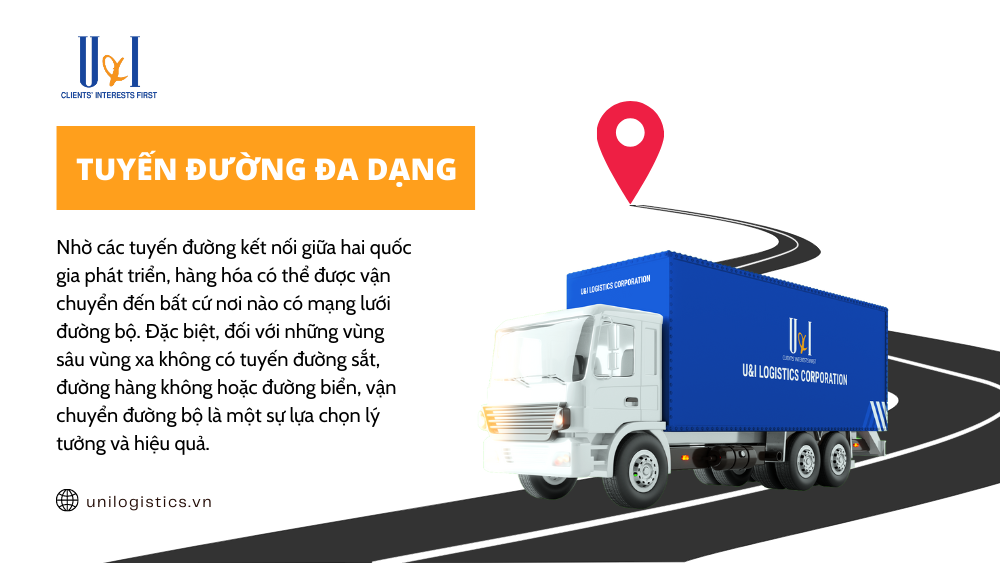 Nhờ các tuyến đường kết nối giữa hai quốc gia phát triển, hàng hóa có thể được vận chuyển đến bất cứ nơi nào có mạng lưới đường bộ. Đặc biệt, đối với những vùng sâu vùng xa không có tuyến đường sắt, đường hàng không hoặc đường biển, vận chuyển đường bộ là một sự lựa chọn lý tưởng và hiệu quả.