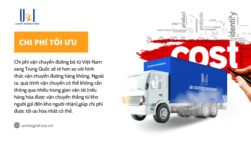 Chi phí vận chuyển đường bộ từ Việt Nam sang Trung Quốc sẽ rẻ hơn so với hình thức vận chuyển đường hàng không. Ngoài ra, quá trình vận chuyển có thể không cần thông qua nhiều trung gian vận tải (nếu hàng hóa được vận chuyển thẳng từ kho người gửi đến kho người nhận) Điều này giúp chi phí được tối ưu hóa nhất có thể.