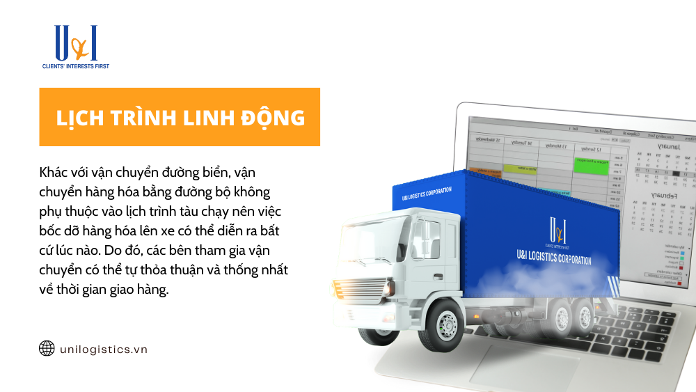 Khác với vận chuyển đường biển, vận chuyển hàng hóa bằng đường bộ không phụ thuộc vào lịch trình tàu chạy nên việc bốc dỡ hàng hóa lên xe có thể diễn ra bất cứ lúc nào. Bên cạnh đó, các bên tham gia vận chuyển có thể tự thỏa thuận và thống nhất về thời gian giao hàng, tạo sự chủ động về thời gian và tăng tính thuận tiện cho các doanh nghiệp xuất nhập khẩu.