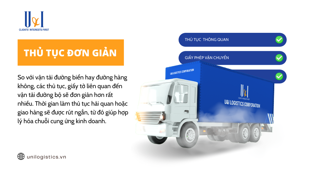 So với vận tải đường biển hay đường hàng không, các thủ tục giấy tờ liên quan đến vận tải đường bộ sẽ đơn giản hơn rất nhiều. Thời gian làm thủ tục hải quan hoặc giao hàng sẽ được rút ngắn, từ đó hợp lý hóa chuỗi cung ứng kinh doanh.